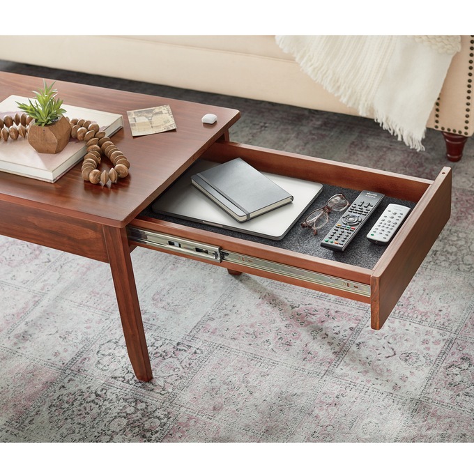 Lift-Top Coffee Table in Cherry Wood Finish Hidden storage beneath top Open shelves for additional storage and display Materials. It has an open shelf in the middle protected by a glass so any décor placed gets viewed. The most common coffee table hidden storage material is paper.