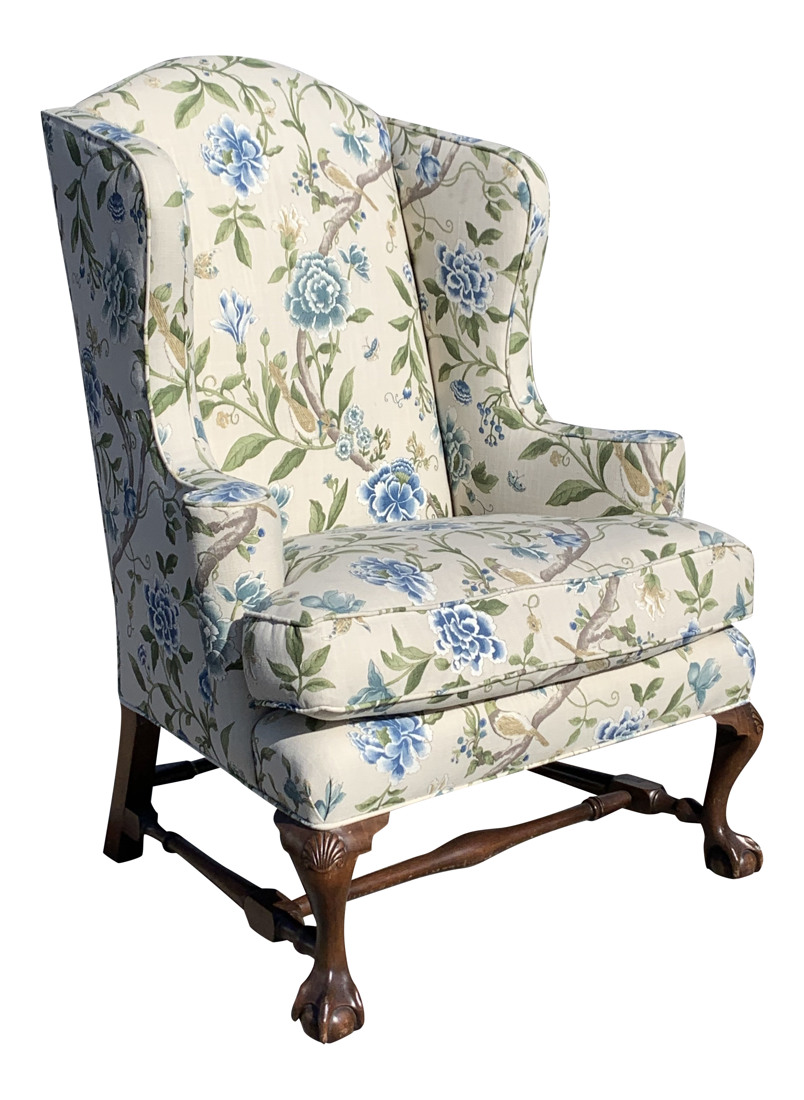 Crewelwork Floral And Bird Print Upholstered Mahogany Wingback Chair At 1stdibs